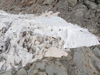 居民合力在隆河冰川铺设白色柏油绒布。铺设帆布的过程甚艰巨。隆河冰川吸引不少游客...