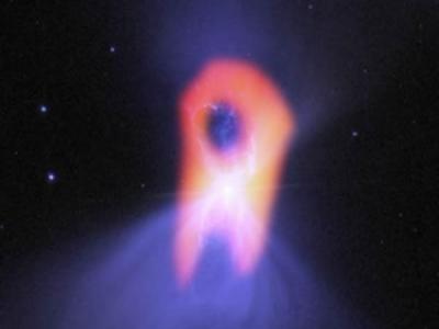 哈勃望远镜可见光下观测到的背景蓝色结构显示了双叶形状,中央有个狭窄区域。ALM...