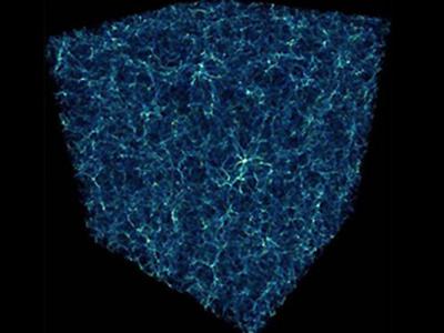超级电脑对宇宙的模拟。中央明亮物体是一个星系团,质量为太阳的1千万亿倍。占据...