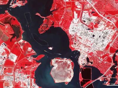 在这幅照片中,水呈现为蓝色,建筑和铺砌表面呈现为棕褐色和灰色;植被呈现为红色...