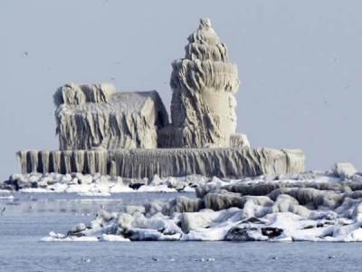 一座位于美国俄亥俄州克利夫兰港的灯塔在严寒和海水波浪的浇灌下,外面完全被冰层所...