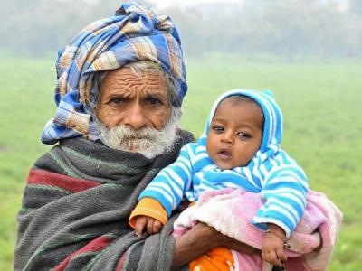 94岁的拉马吉特·拉格哈夫在印度哈里亚纳邦的住宅外抱着两个月大的儿子菲克拉吉特...