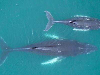 座头鲸母亲和幼鲸在南极洲。研究表明,磷虾供应减少会导致座头鲸怀孕减少。学分:杜...
