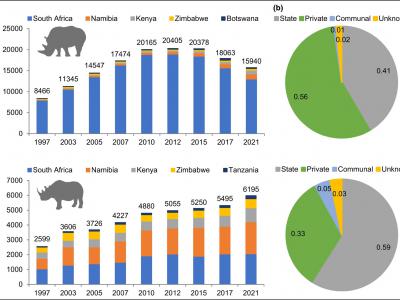 在分别保护99%和97%白犀牛(上)和黑犀牛(双角兽)(下)种群的国家中,(a)1997...