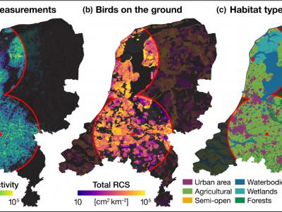 (a)从荷兰两个运行中的天气雷达装置的测量中得出的垂直积分反射率,显示了鸟类飞行...