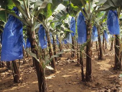 食物生产的整个过程都会使用到塑料。 图中位在喀麦隆的农场就用塑料袋套住成长中的...