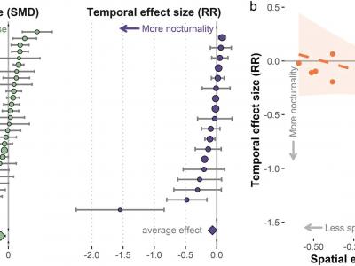 人类干扰对所有31个研究点的狮子空间利用和夜间活动的影响。负面影响的大小表明,在...