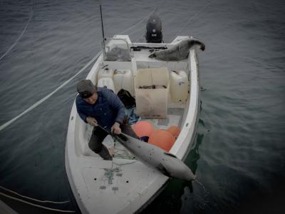 格陵兰岛的传奇猎人Hjelmer Hammeken在伊托克托米尔特港将一只海豹带上了船。(神秘...