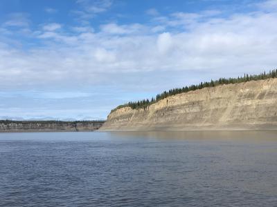 加拿大马更些河两岸的沉积岩,这是一个主要的河流盆地,岩石风化是二氧化碳的来源。...
