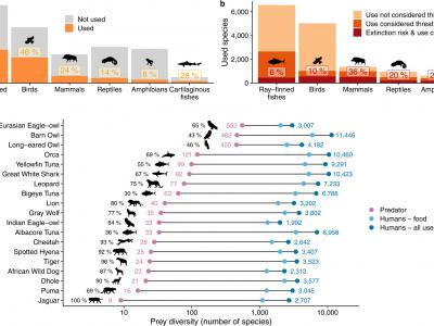 人类和其他食肉动物对脊椎动物的利用。a有人类使用记录的脊椎动物物种的数量和百分...