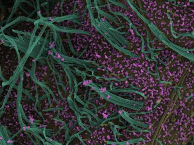 扫描式电子显微镜的图像显示,同时感染A型流感和呼吸道融合病毒(RSV)的人类肺细胞...