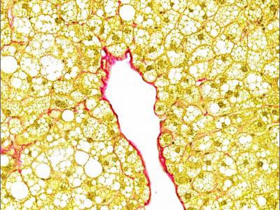 一份肝脏组织样本显示了肝病的典型特征,尽管缺乏坏死反应所需的一个关键基因。充满...