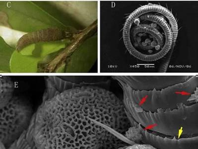 A角麦蛾访雄花;B角麦蛾访雌花;C角麦蛾幼虫取食寄主嫩叶;D角麦蛾口器上携带寄主...