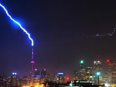 闪电击中加拿大国家电视塔 5月29日夜,加拿大多伦多,一道闪电击中了加拿大国...