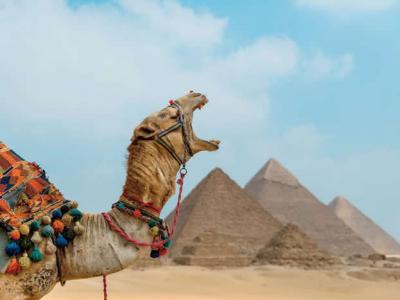 一只骆驼在雄伟的吉萨金字塔群前打呵欠。 PHOTOGRAPH BY CLAI...