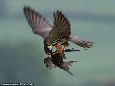 小隼空中捕猎雨燕 一位英国业余摄像师拍摄到小隼半空中捕捉猎物的精彩镜头...
