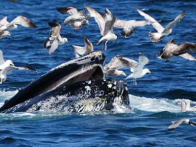 海鸥从驼背鲸口中抢食 驼背鲸进食常伴随着成群等待机会的海鸥。有时这些鸟儿会飞...
