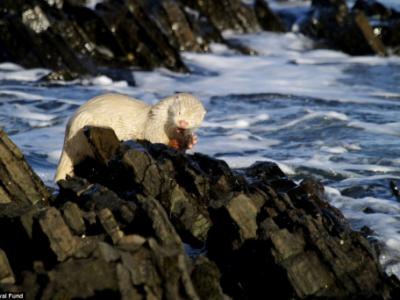 一只罕见的白化水獭正在海边的石壁上享受美味的鱼宴早餐 乍一看上去,这只水獭...