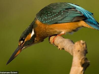 翠鸟停在枝条上耐心地注视着水中 翠鸟发现猎物后,马上俯冲下去。 翠鸟一口...
