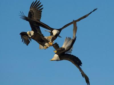 三只白头鹰为了争夺食物,在空中展开肉搏战,结果纠缠一起 白头鹰爪子彼此相扣...