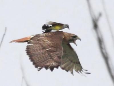 美洲食蜂鹟击退入侵巢穴的红尾鹰