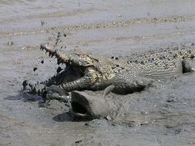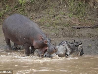 河马口中死里逃生的黑尾牛羚 河马口中死里逃生的黑尾牛羚 一只黑尾牛羚从一头...