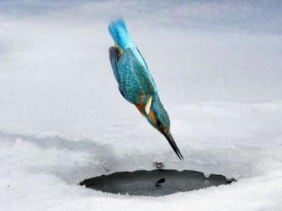 翠鸟穿过冰层捕鱼 翠鸟水下捕鱼的瞬间 翠鸟捕鱼后飞离水面 翠鸟一下捕到...