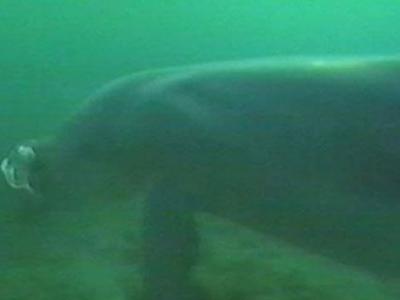 宽吻海豚捕猎墨鱼 叼在嘴中反复摇摆冲洗墨鱼体内的墨汁 将墨鱼尸体在海底进...