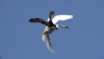 一只号声天鹅在飞行途中,突遭白头秃鹰袭击的罕见一刻 勇敢的天鹅逃出白头秃鹰...