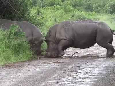 南非犀牛为争地盘,以角互牴各不相让视频:南非犀牛为争地盘,...