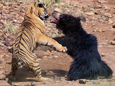 印度马哈拉施特拉邦的塔杜巴国家公园上演“熊虎大战”视频:印...