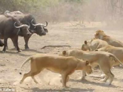 赞比亚国家公园上演水牛大战万兽之王狮子