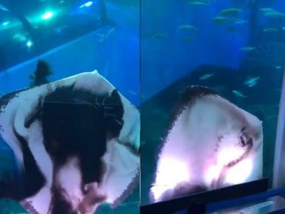 日本横滨市八景岛海岛乐园水族馆魟鱼活吞乌贼视频:...