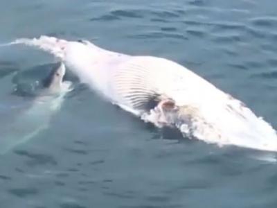 美国科德角观光客近距离直击大白鲨张口咬鲸鱼尸体视...
