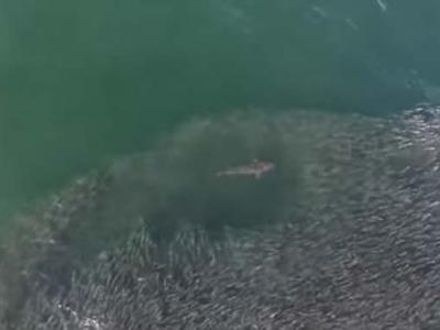 美国纽约鲨鱼冲入鲱鱼群吃“自助餐”视频:美国纽约...