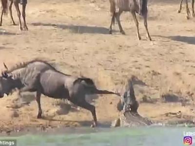 南非克鲁格国家公园牛羚被鳄鱼咬脚拖入水,千钧一发...