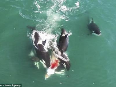俄罗斯西伯利亚对开海域杀人鲸群起猎杀小