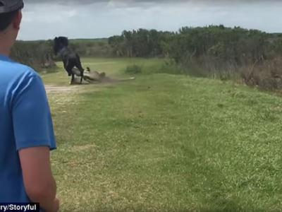 美国佛罗里达州一匹马主动攻击凶猛鳄鱼