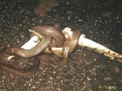 动物界奇观:澳洲西部金伯利3米蟒蛇轻易猎杀淡水鳄...