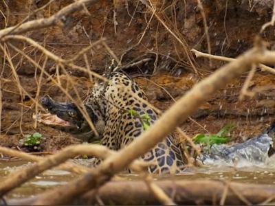 美洲豹在河中与大鳄搏斗。 美洲豹一口咬向大鳄后颈。 大鳄立即失去反抗能力...