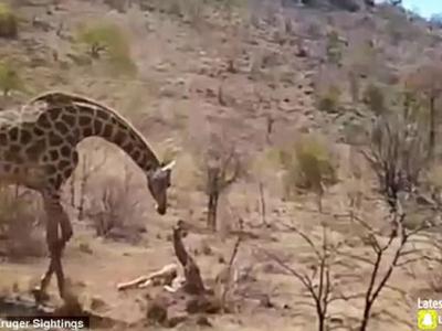 南非两只狮子要捕猎断脚的孩子,长颈鹿妈妈扑救 视频:南非两只狮子要...