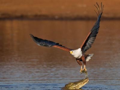 南非克鲁格国家公园大胆鱼鹰与鳄鱼水中争食