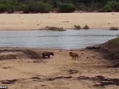 南非母河马体力不支倒河岸边狮王觊觎 小