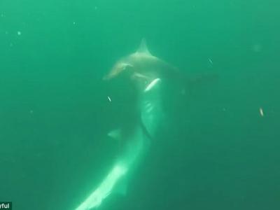 美国男子拍下虎鲨和双髻鲨两条海中霸王决斗场面 视频:美国男子拍下虎...