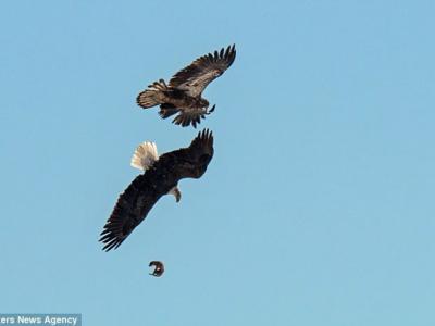 美国两只秃鹰在空中争夺一只土拨鼠,猎物空中掉落后俯冲抓回 (神秘的地...