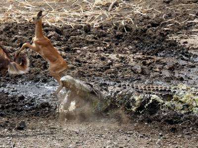 南非克鲁格国家公园老谋深算鳄鱼张开血盆大口等着涉世未深小黑斑羚自投罗...