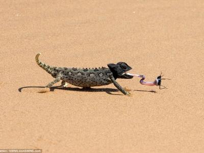 纳米比亚沙漠纳马夸变色龙从后方捕食毫无