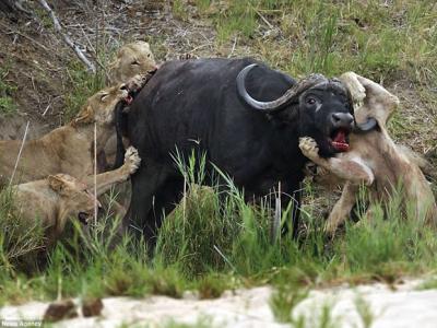 南非马拉马拉动物保护区大水牛被围攻,将尖角狠狠刺进狮子腋下 (神秘的...