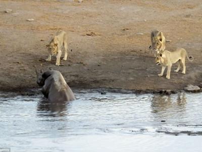 南非埃托沙国家公园怀孕犀牛受困水坑,奋力抗击3只狮子逃生 视频:南...