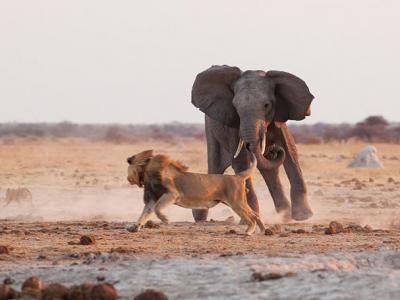 博茨瓦纳纳塞潘国家公园雄狮与公象为争夺水源展开激战 雄狮被迫采取了某些避让...